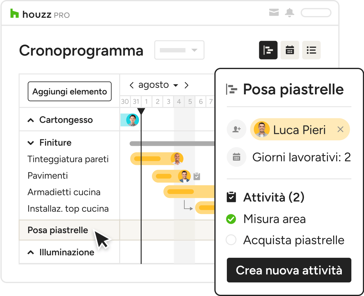 Il tuo calendario deve lavorare tanto quanto te. Il nostro cronoprogramma ti consente di pianificare le fasi del progetto e di collegare attività dettagliate per il tuo team e i subappaltatori.