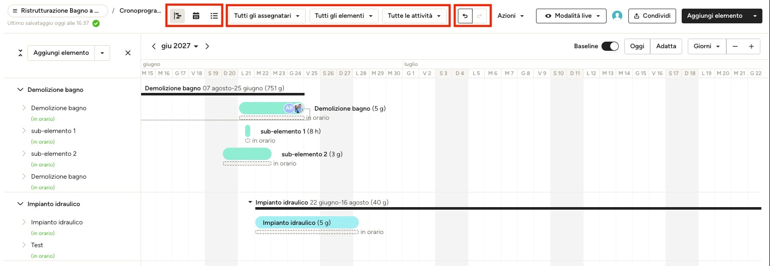 A dipendenza dal tuo pacchetto, hai accesso a due ulteriori funzioni nel cronoprogramma: la modalità "Live/Modifica" e la "Baseline".