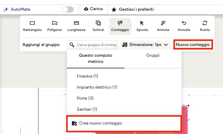 Se desideri risparmiare tempo nei tuoi conteggi, puoi utilizzare la tecnologia AI AutoMate per aiutarti a rilevare gli elementi. Leggi AutoMate AI per computi metrici per saperne di più sul conteggio AI e sul riconoscimento dei simboli AI.