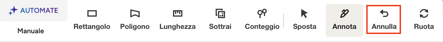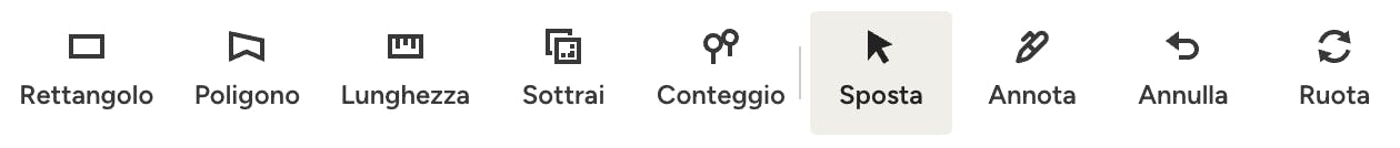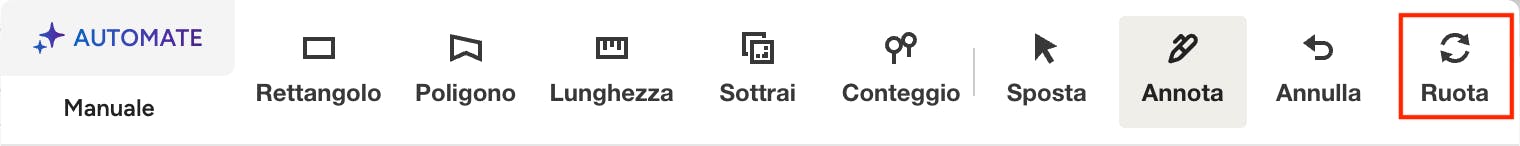 L'icona di rotazione appare nella barra degli strumenti solo prima di effettuare le misurazioni sulla planimetria. Una volta effettuata una misurazione, non sarà più possibile ruotare la planimetria. È sufficiente fare clic sull'icona "Ruota" per modificare l'orientamento della planimetria.