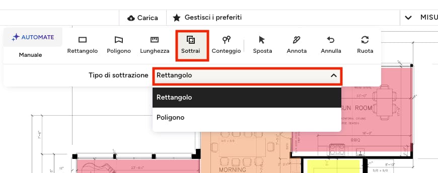 Per iniziare, fai clic sull'icona di sottrazione, quindi seleziona il tipo di sottrazione dal menu a discesa - puoi scegliere un rettangolo o poligono. Una volta selezionata la forma desiderata, fai clic e trascina il cursore da un angolo dello spazio all'angolo successivo. Lascia il cursore una volta completata la misurazione.
