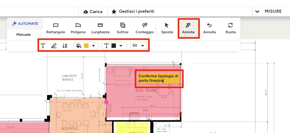 L'icona di annotazione consente di scrivere appunti direttamente sull'area di disegno. Questi appunti appariranno su qualsiasi PDF, in modo da poterle condividere facilmente con i clienti e/o il team.