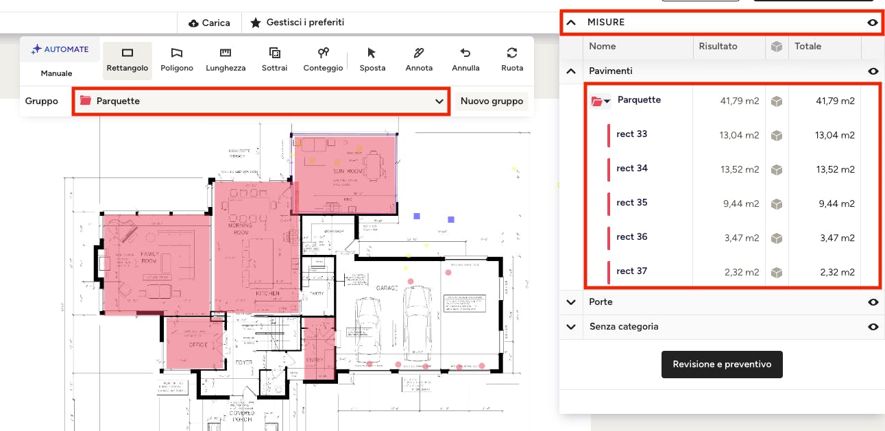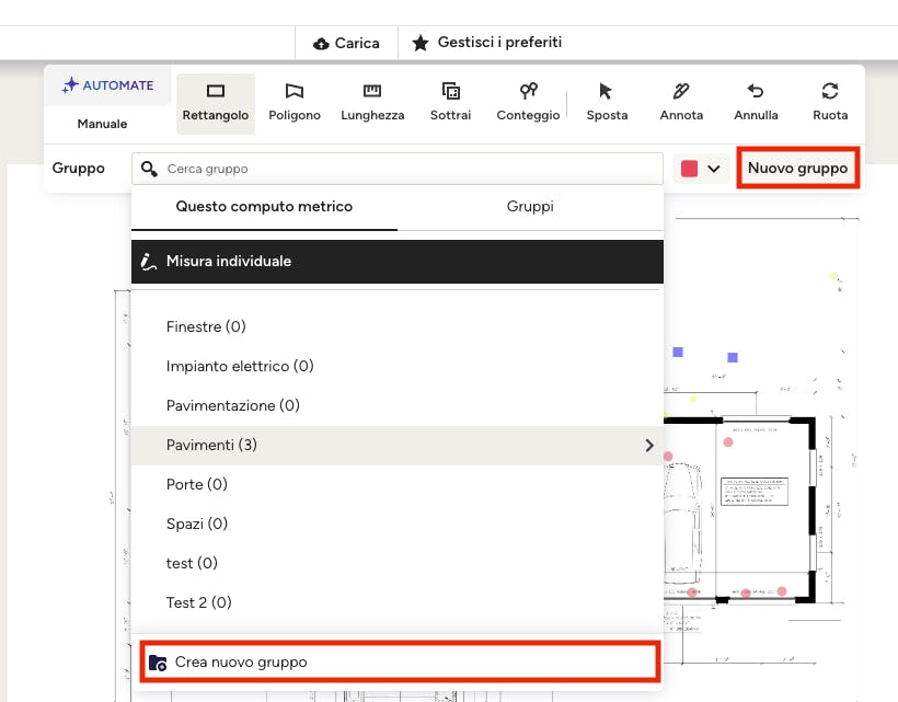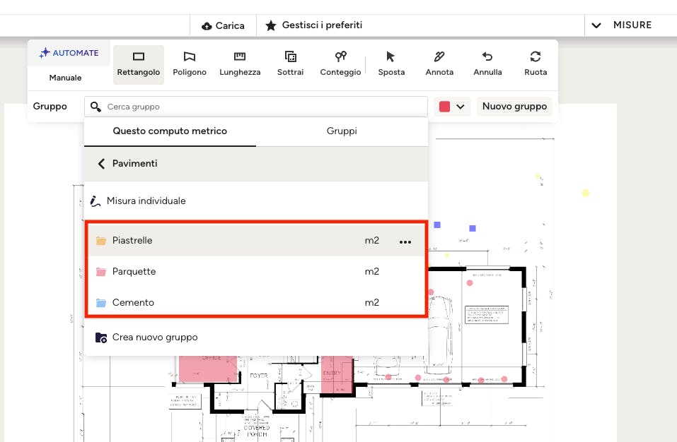 Raggruppando le misure è più facile ottenere i totali dei materiali del progetto, anche utilizzando i gruppi salvati. Impostare le categorie e i gruppi fin dalle prime fasi del processo di misurazione ti aiuterà a rimanere organizzato durante la creazione dei computi metrici, oltre ad aiutare i clienti e/o gli altri membri del team a capire cosa stanno guardando.