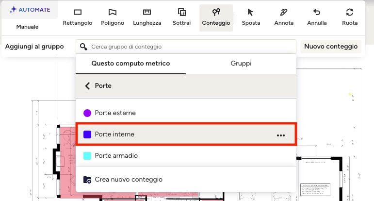 In questo esempio, il quadrato blu sta contando il numero di porte interne, che appariranno nel nuovo gruppo nella sezione "Misure".