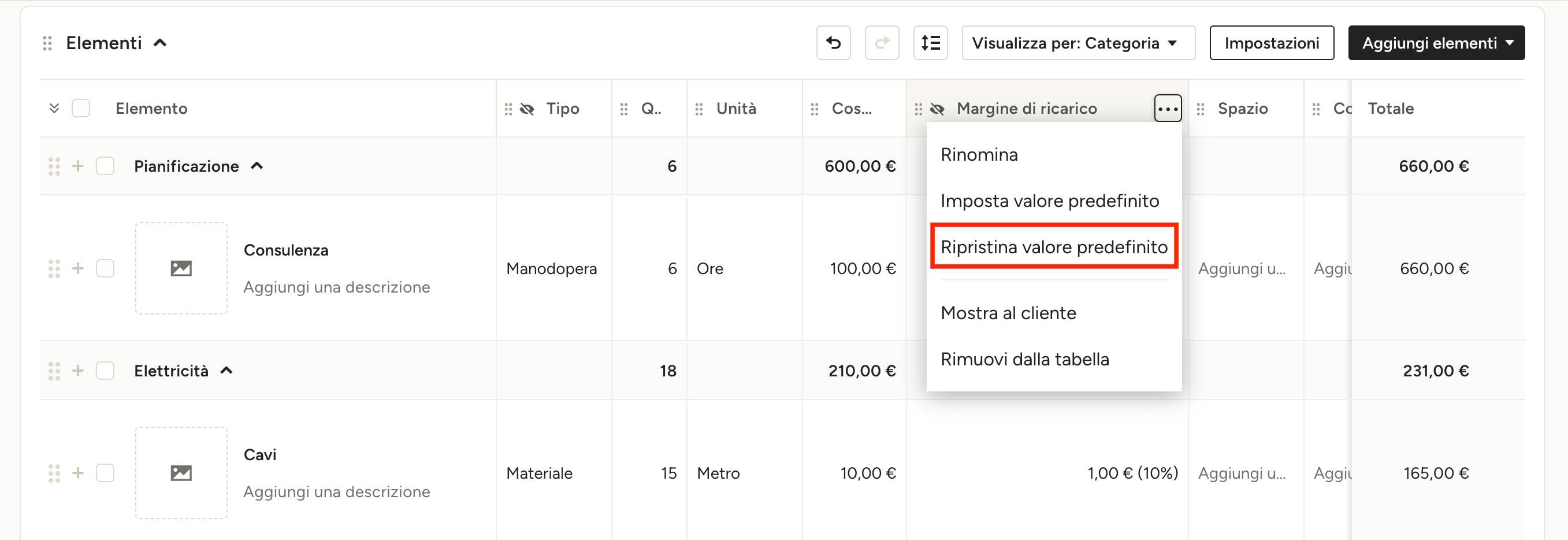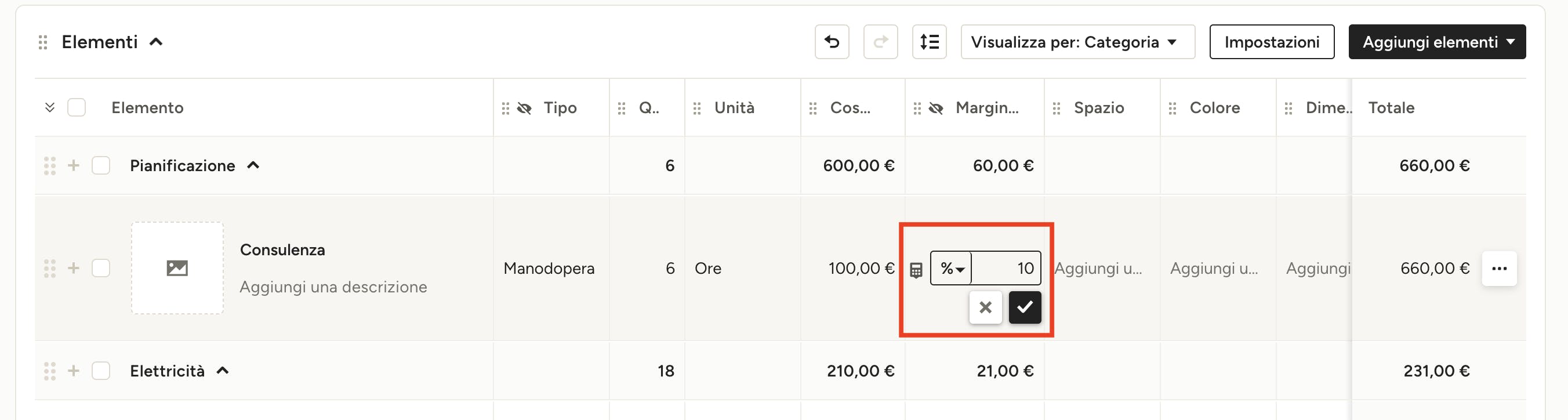 Se hai un unico margine di ricarico per tutti o per la maggioranza degli elementi nel tuo preventivo, puoi applicarlo per tutti gli elementi in un unico clic.