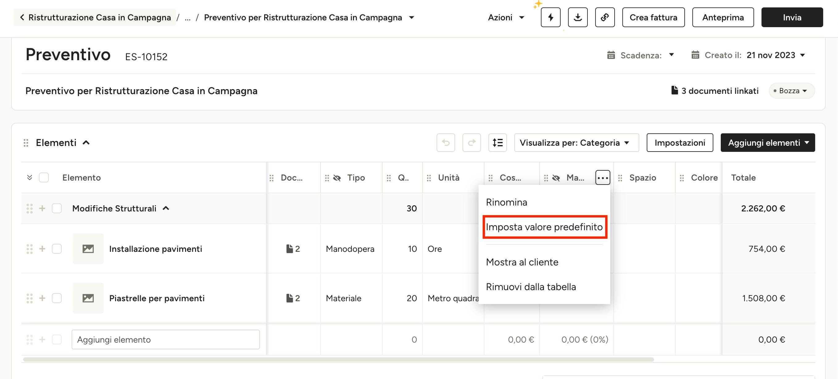Una volta che hai creato un preventivo, trova la colonna "Margine di ricarico" nel tuo preventivo e seleziona i tre puntini. Seleziona "Imposta valore predefinito" dal menu a tendina.