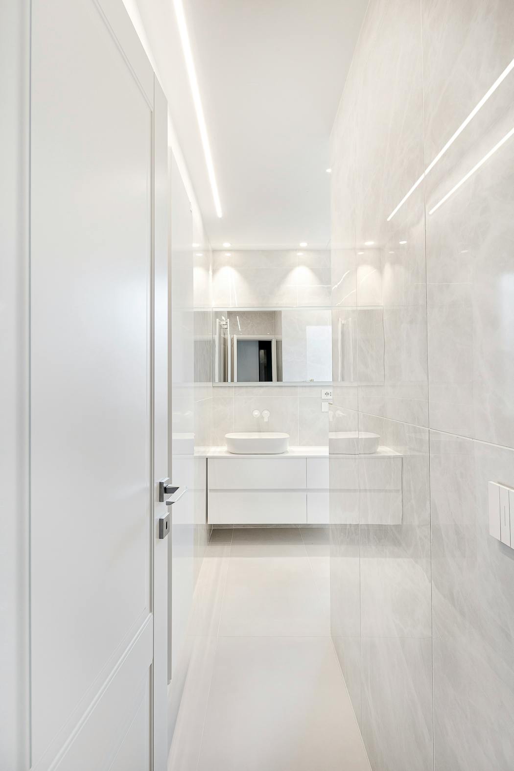 Il bagno ha subito un restyling importante, lavorando con la luce e con i suoi effetti sulle diverse superfici, utilizzando ceramiche con finiture differenti ma sempre di tonalità chiare in accoppiata alle componenti metalliche della rubinetteria e dei profili, anch'essi bianchi.