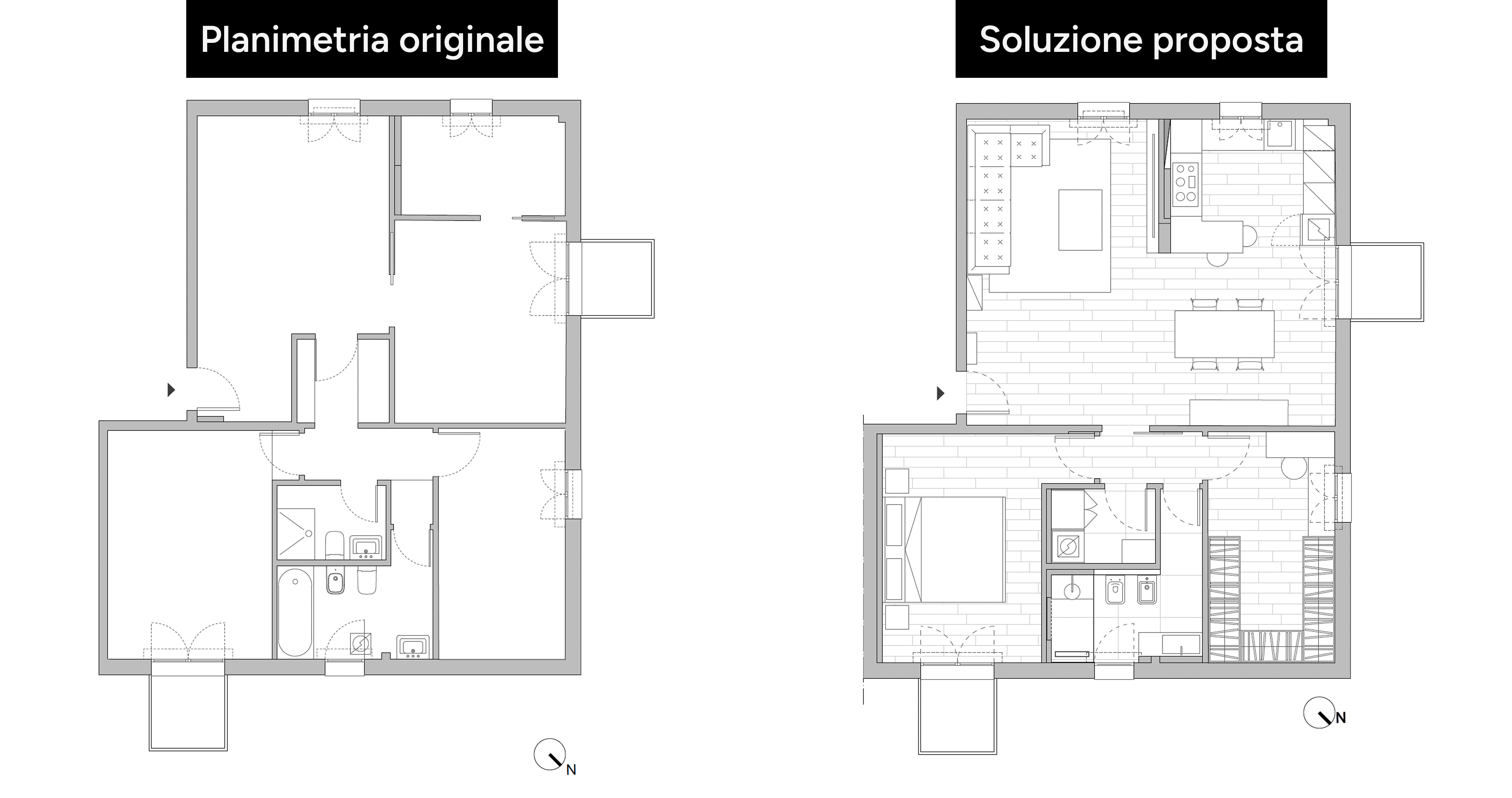 Abbiamo fatto diverse proposte, ragionando in particolar modo sulla disposizione della cucina e dell'arredo nella zona giorno, valutando i pro e i contro di ogni scelta e cercando quella che più si confacesse alle loro esigenze.