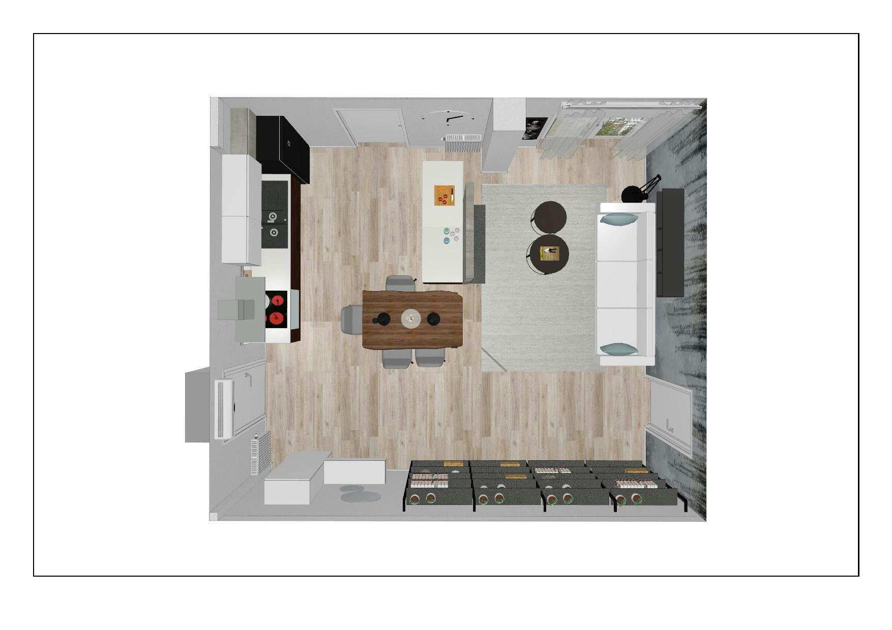 Innanzitutto ho studiato una disposizione più soddisfacente, invertendo divano e tv dello stato attuale ho trovato posto per il tavolo appoggiandolo all'isola. Per poter fare questo ho dovuto creare una parete divisoria centrale, una sorta di quinta, dove appendere la tv. Ho poi arredato con uno stile più industriale come il tavolo, la lunga libreria a montanti in metallo. Per la parete divisoria ho usato una pittura effetto cemento che riprende lo sfondo della carta da parati usata per la parete del divano, il resto delle pareti ha una lieve tinta di grigio. Ho controsoffittato tutto il perimetro e la parte centrale dell'isola. Lungo il perimetro, oltre al controsoffitto, ho proposto una veletta sporgente per una luce indiretta dimmerabile.