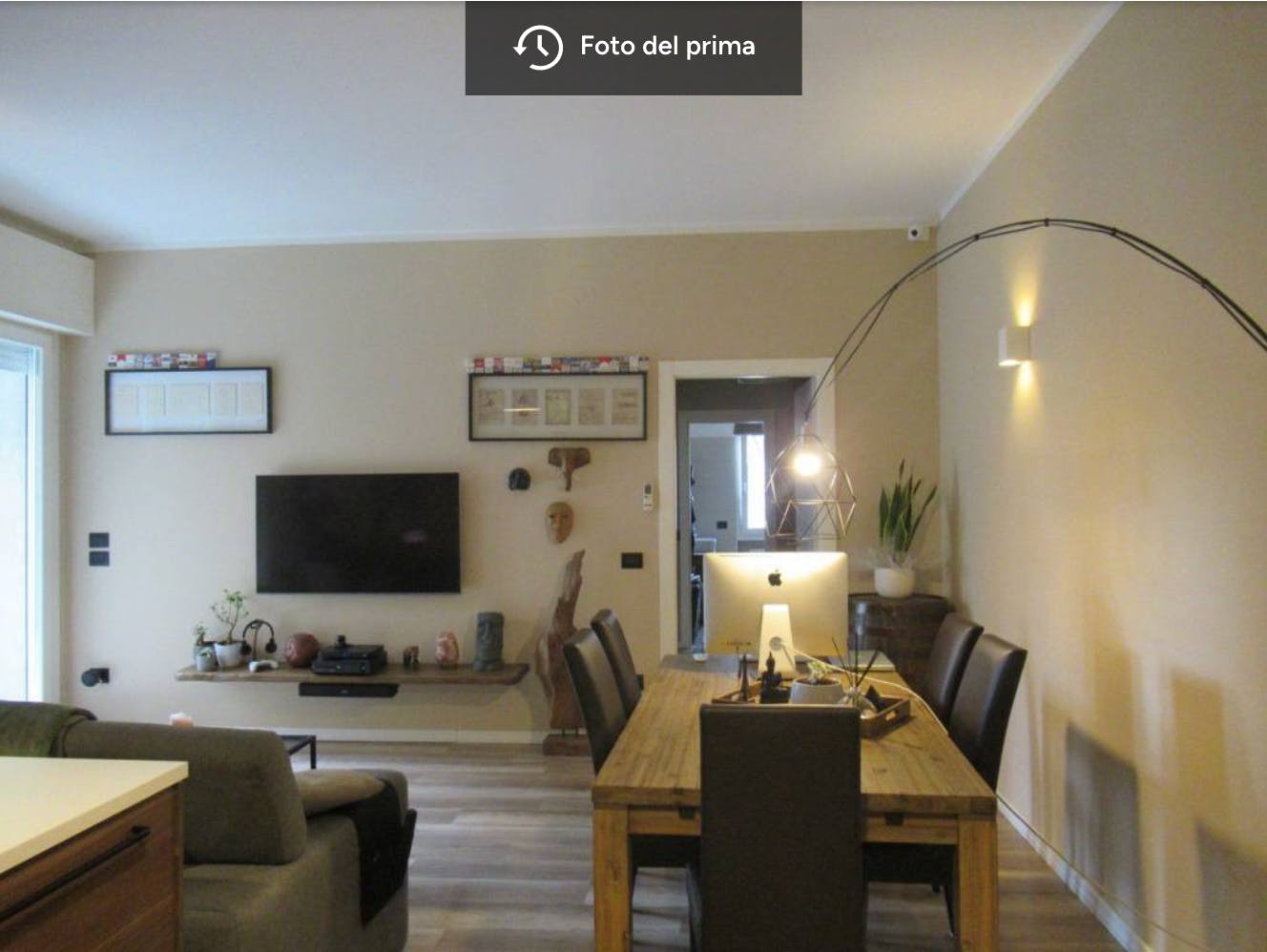 Si tratta di una casa acquistata da poco che presenta già delle cose come la cucina, che il cliente vuole tenere. Lo stile in generale lasciato però non rappresenta tanto il cliente che è orientato più su uno stile industriale. L'intervento riguardava quindi cambiare volto all'open space tenendo la cucina e trovare una disposizione soddisfacente per il tavolo e la zona divano con tv, conservando l'isola. Un’altra richiesta era di avere tanti ripiani a giorno per potere esporre tutti i ricordi dei tanti viaggi fatti.