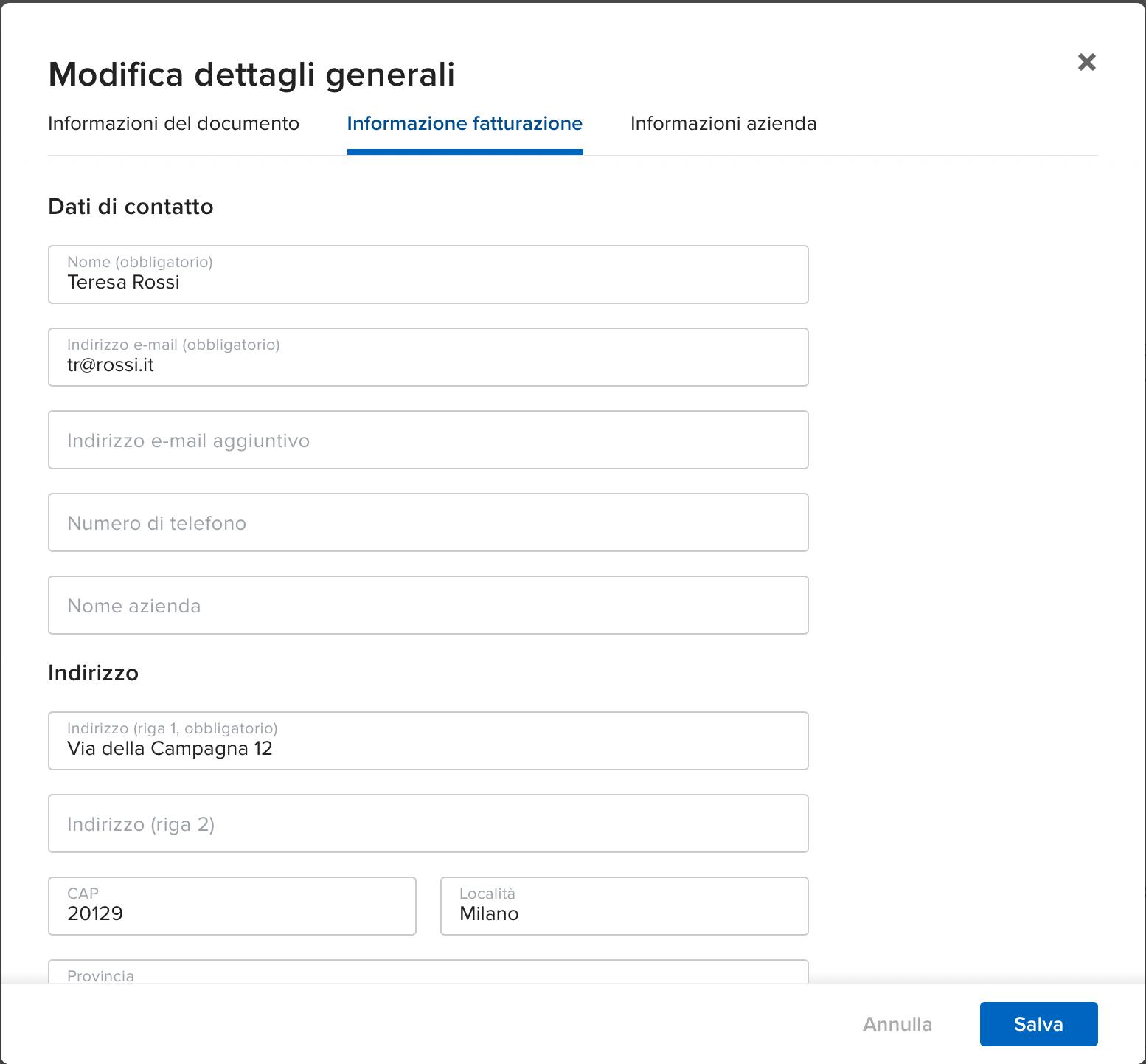 1. Clicca sull'icona a forma di matita per aggiornare i dettagli di fatturazione del tuo preventivo senza modificare il profilo del cliente. Aggiungi campi personalizzati in un clic.