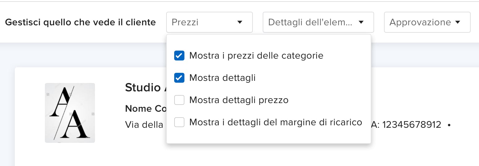 Con il nuovo layout è più facile visualizzare in anteprima il preventivo e scegliere esattamente come apparirà ai clienti. Vai su 'Impostazioni', seleziona le caselle pertinenti per le informazioni sui prezzi che desideri mostrare e per impostare l'approvazione per ogni singola voce di preventivo. Quando il preventivo è pronto, clicca su 'Condividi' e utilizza i modelli di messaggio salvati, anzichè scrivere ogni volta una nuova e-mail da zero.